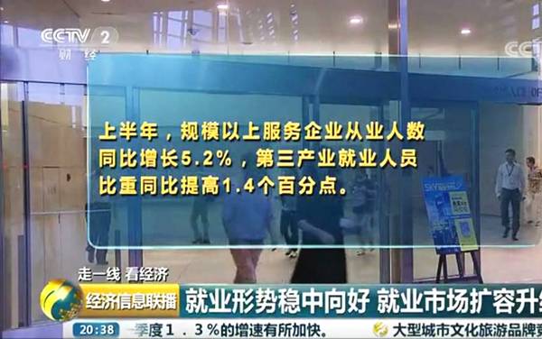 摘要 : 日前,CCTV2央視財(cái)經(jīng)頻道《經(jīng)濟(jì)信息聯(lián)播》報(bào)道:2018年上半年,全國規(guī)模以上服務(wù)企業(yè)從業(yè)人數(shù)同比增長5.2%,第三產(chǎn)業(yè)就業(yè)人員比重同比提高1.4個(gè)百分點(diǎn),就業(yè)形勢穩(wěn)中向好,就業(yè)市場擴(kuò)容升級(jí)。