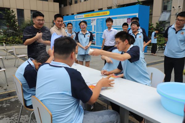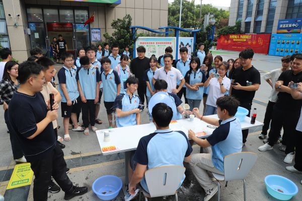 隨著清脆的哨聲,一場別開生面的“蒙眼倒水接力”率先上演。這是一個(gè)體現(xiàn)學(xué)子們勇敢與身手敏捷的游戲。每當(dāng)有人成功將水倒入后面的水盆中時(shí),周圍立刻爆發(fā)出陣陣歡呼與掌聲,參與游戲的同學(xué)那份成就感與喜悅,在夏日的空氣中久久回蕩,仿佛帶大家回到了純真無邪的童年時(shí)光。